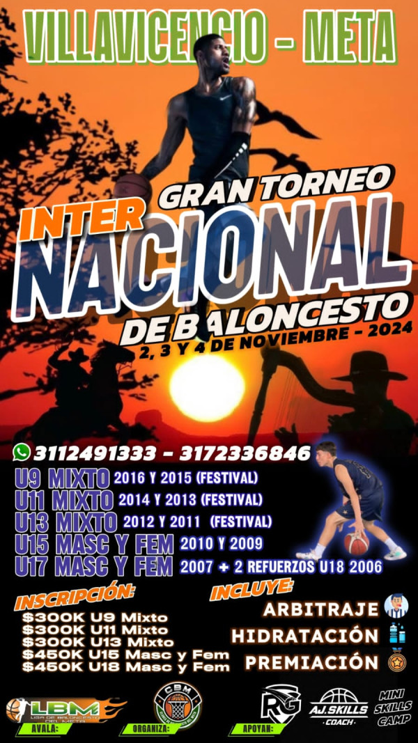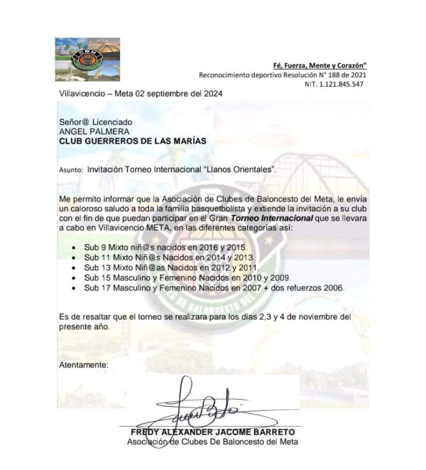 El Club de Baloncesto Guerrero Las Marías ha recibido una emocionante invitación de la Asociación de Clubes de Baloncesto en Villavicencio, Departamento del Meta, Colombia, para participar en el prestigioso **Torneo Internacional Llanos Orientales**. Este evento se llevará a cabo en las categorías **U15 Femenino, U15 Masculino y U17 Masculino**, los días 2, 3 y 4 de noviembre, brindando así una plataforma para que los jóvenes talentos del baloncesto muestren sus habilidades a nivel internacional.