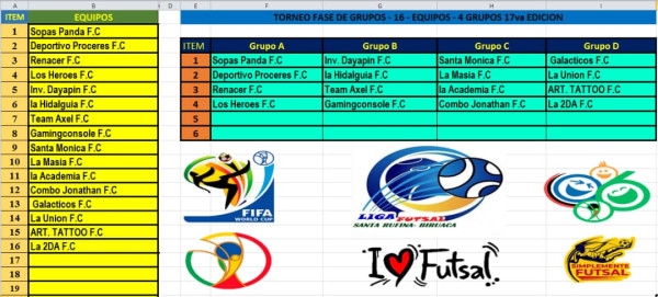 - **Grupo A**: Sopas Panda F.C, Deportivo Próceres F.C, Renacer F.C, Los Héroes F.C