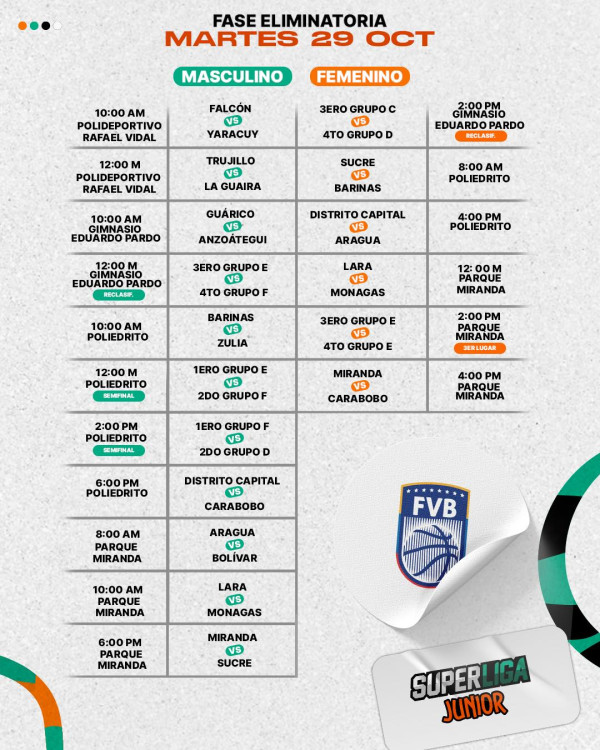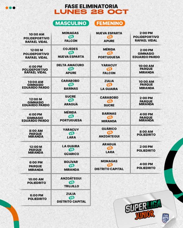Para este lunes 28 de octubre, se programan dos partidos clave: la selección masculina de Apure competirá contra Delta Amacuro a las 4:00 PM en el Polideportivo Rafael Vidal, mientras que el equipo femenino se medirá ante Nueva Esparta a las 2:00 PM en la misma sede.