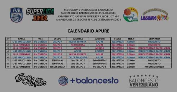 Desde el sábado 26 de octubre hasta el 1 de noviembre, el estado Apure se encuentra representado en el Campeonato Nacional Súper Liga Junior Masculino y Femenino de la categoría U-17, que se lleva a cabo en Miranda-Caracas 2024. Esta competencia es una plataforma crucial para los jóvenes talentos del baloncesto apureño está dejando su huella con un equipo tanto masculino como femenino.