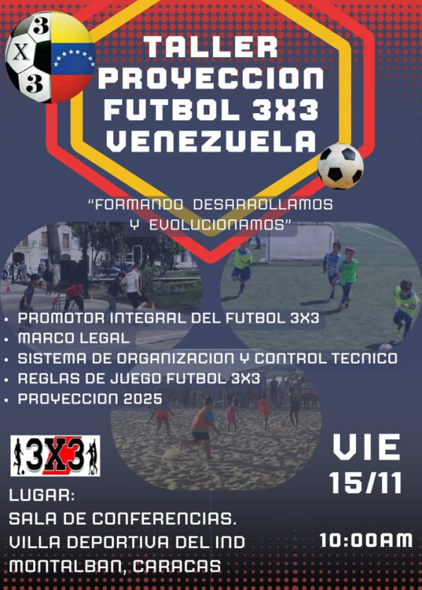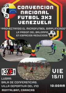 El próximo viernes 15 de noviembre, a las 10:00 am, se llevará a cabo la Convención Nacional de Fútbol 3x3 en la Sala de Conferencias de la Villa Deportiva del IND, ubicada en Montalbán, Caracas. Este evento tiene como propósito proyectar el MicroFútbol simplificado, celebrando la pasión del balompié en espacios reducidos.