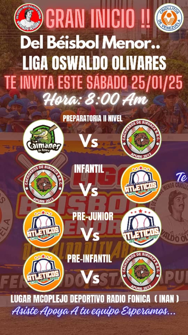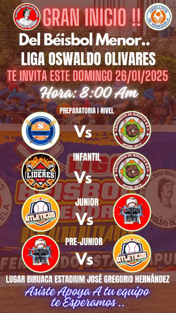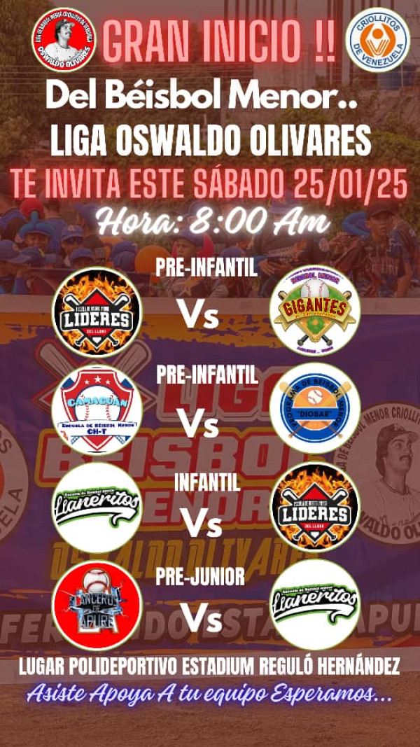 La Liga Béisbol Menor Osvaldo Olivares tiene el placer de invitar a todos los amantes del béisbol a su reinicio de juegos, que se llevará a cabo este sábado 25 y domingo 26 de enero en varios escenarios deportivos.