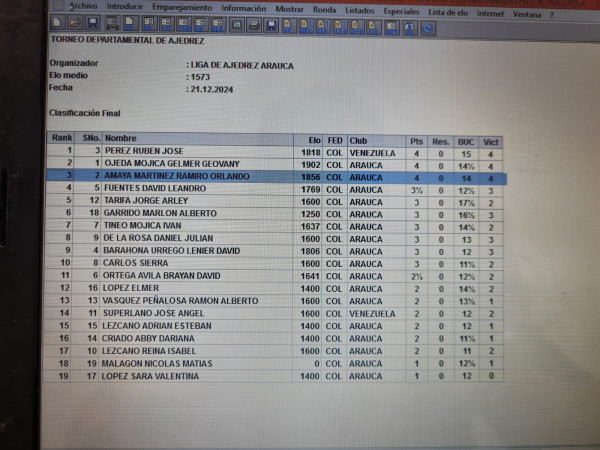 Sin embargo, la competencia fue feroz. En un inusual giro de eventos, el segundo y tercer lugar también se definieron por la misma cantidad de puntos. El colombiano Ojeda Gelmer logró posicionarse en el segundo lugar, también con 4 puntos, mostrando una gran tenacidad y determinación en sus partidas. Por su parte, Ramiro Amaya, otro destacado colombiano que recientemente quedó 3ro en un nacional Inter colegiados, completó el podio al obtener igualmente 4 puntos, lo que refleja la alta calidad del torneo y la intensidad de las partidas disputadas.
