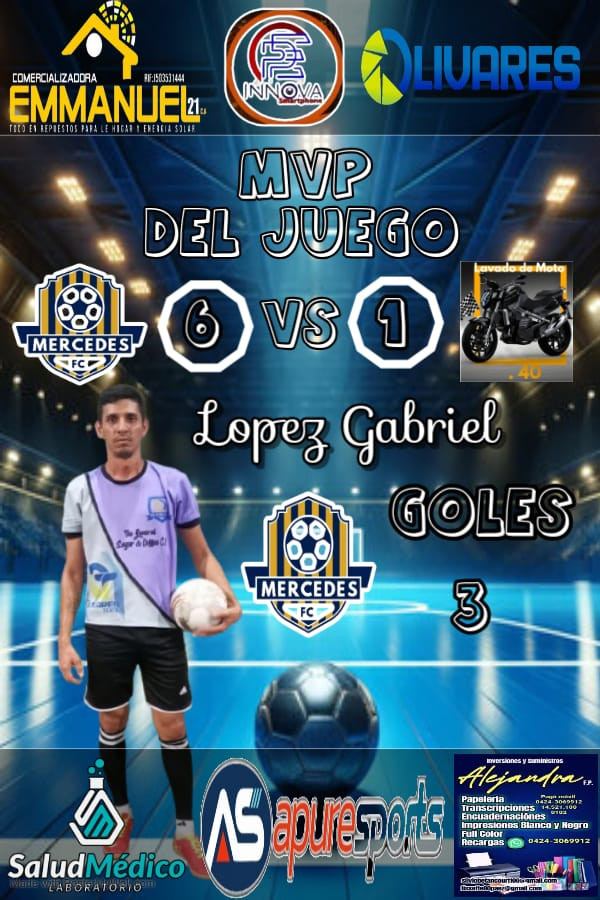 Mercedes FC se llevó la victoria con un contundente 6-0 ante Lavado de Moto .40. El jugador más valioso del partido fue López Gabriel, quien brilló al anotar tres goles, demostrando su gran capacidad ofensiva y liderazgo en el campo.