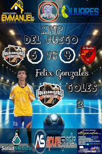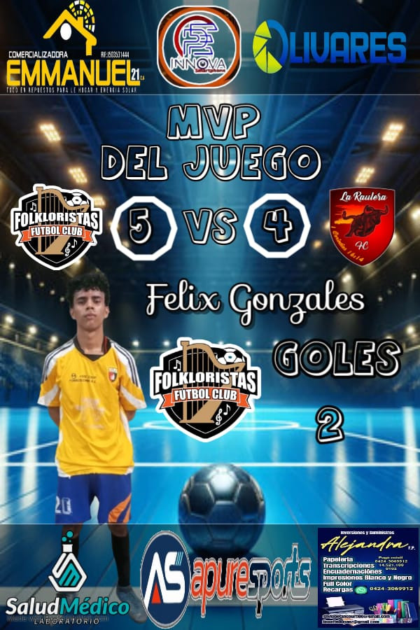 Folcloristas FC se impuso en un emocionante partido contra La Raulera FC, con un marcador final de 5-4. El destacado del encuentro fue Félix González, quien anotó dos goles y se convirtió en el jugador más valioso del partido, contribuyendo significativamente al triunfo de su equipo.